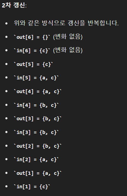 in[n] 먼저 구하는데, in[n] 은 use[n] U (out[n] - def[n]) 이다.